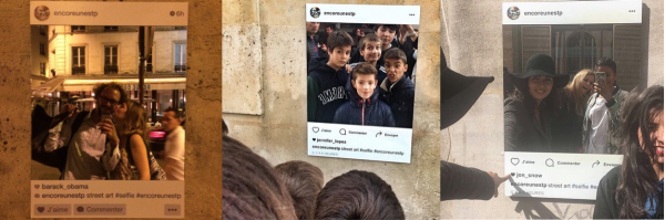Le retour a tout de suite été positif. La mise en abyme que je proposais avec mon installation de rue a fonctionnée instantanément. On peut parler d’une forme de street art 2.0 puisque contrairement aux autres œuvres de rue, il est impossible avec la mienne d’avoir deux fois la même photo qui circule sur la toile. Chaque « selfiste » faisant partie de mon œuvre, ou plutôt NOTRE œuvre car si on considère le selfie comme de l’art, on obtient de l’art dans l’art, une œuvre dans l’œuvre.