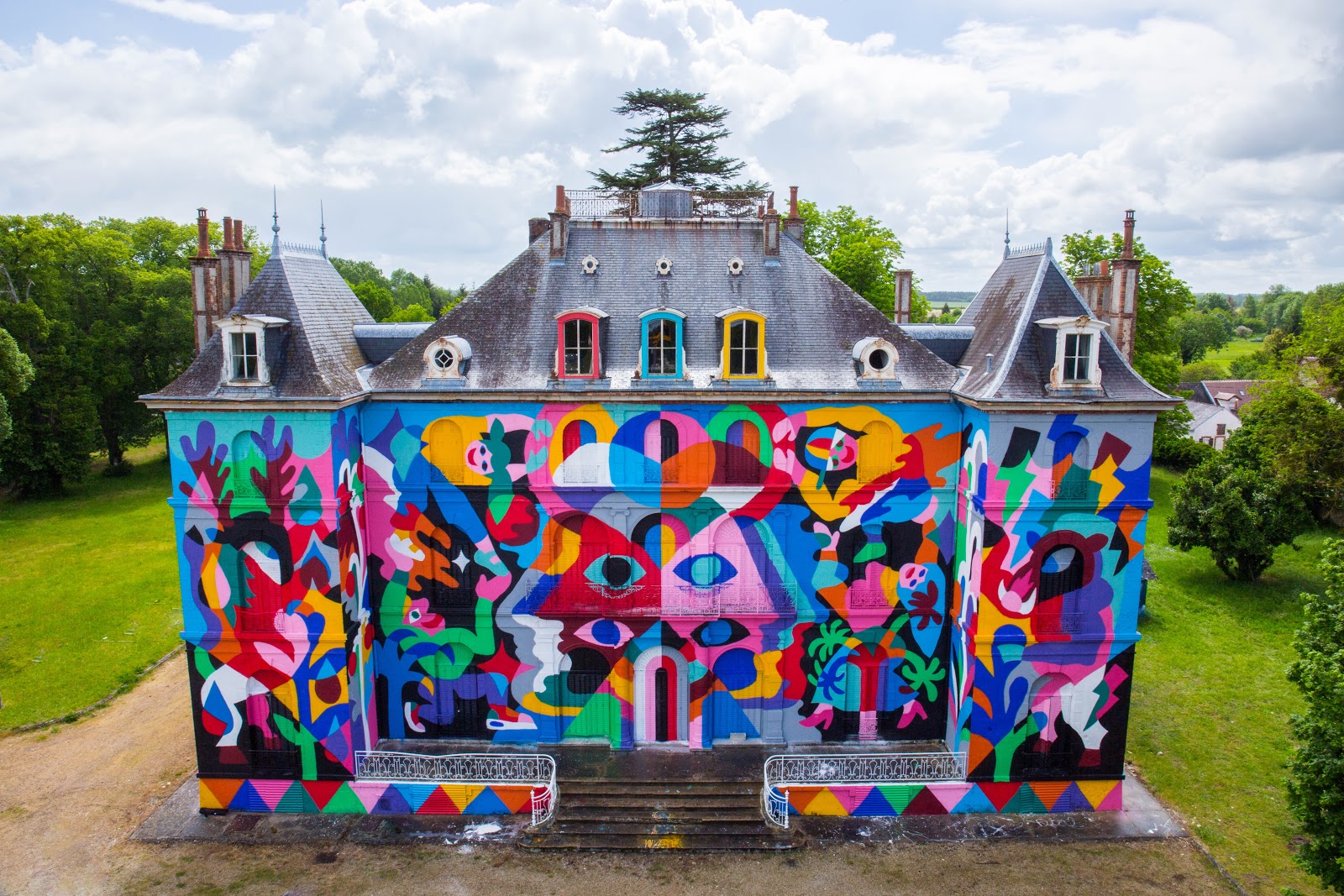 Devenu l’icône du Gâtinais et du LaBel Valette Festival, le château de la Valette continue de traverser l’Histoire, sous l’impulsion de l’art urbain. En 2017, l’artiste espagnol Okuda et ses célèbres crânes colorés avaient pris possession de la façade du château. Aujourd’hui, c’est 3ttman et sa frise pleine d’espoir sur l’humanité qui recouvrent l’intégralité de cette bâtisse du 19e siècle. Une oeuvre monumentale qu’il a nommé “Allégria” (la joie en espagnol) !