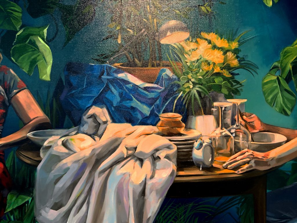 Avec ces personnages qui affrontent des passages a vide dans leur stase un peu suspendu , elle a voulu ajouter quelques contrastes, avec une touche de fond coloré, une densité matérielle donnée par les objets présents, et notamment par les masses de tissus que l’on retrouve dans beaucoup de ses peintures.