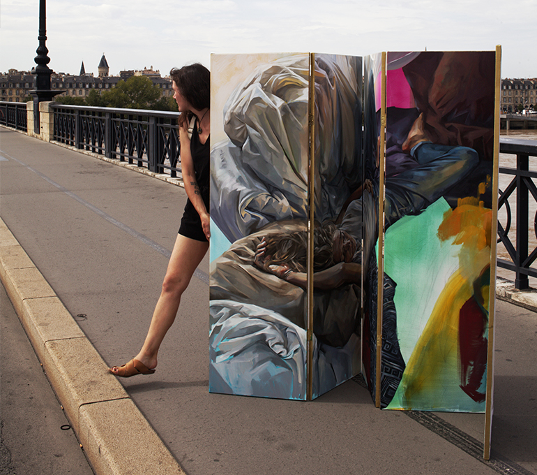 Elle a combiné une façon de faire qui lui vient de son parcours a l’École des Beaux Arts de Bordeaux, l’observation de toile de maitre, en prenant en compte son expérience dans le street art, afin de nous conter des histoires et des moments à travers ses images.