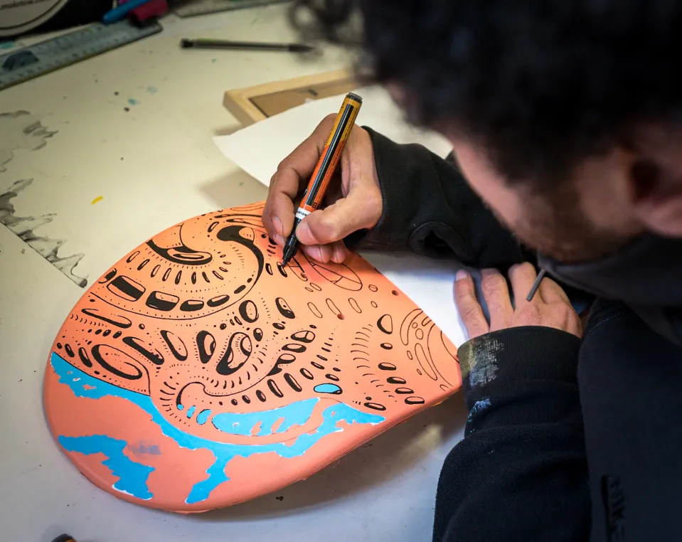 Carte (et board) blanche a été donnée à chaque artiste dans la réalisation de leurs 4 skates en seulement 1 mois et demi top chrono. Un défi qu’ils ont su relever avec brio et dont le résultat est à admirer en avant première lors du vernissage le 05 mars.