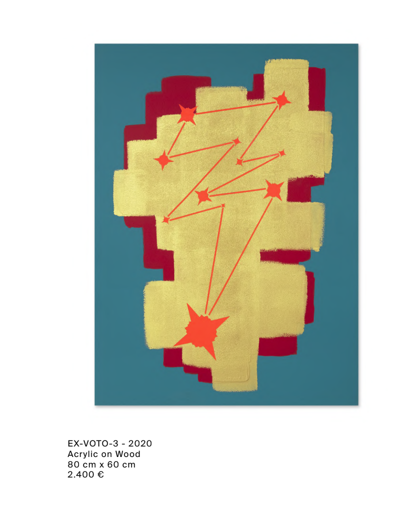 Mon autre toile, « ex-voto » parle de la dévotion présente dans le mouvement graffiti et street art. C’est comme les gens qui jettent des pièces dans les fontaines. Ce geste répétitif et une volonté d’agir. Cela m’inspire également.
